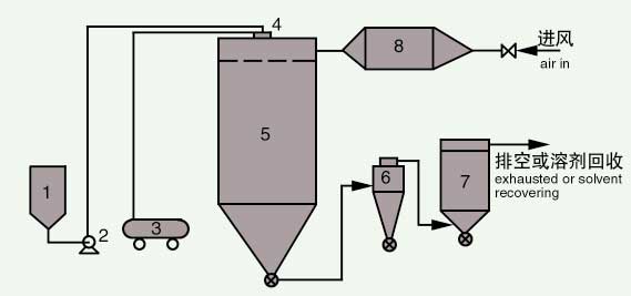 1.液料槽 2.液料泵 3.壓縮空氣 4.氣流噴嘴 5.干燥塔 6.旋風(fēng)分離器 7.布袋除塵器 8.加熱器