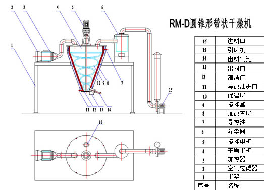 產(chǎn)品概述:RM-D型圓錐形帶狀干燥機是我公司推出的“節(jié)能、經(jīng)濟”型干燥設(shè)備之一,設(shè)備由加熱系統(tǒng)、加熱錐體、傳動系統(tǒng)、螺旋帶狀攪拌系統(tǒng)、熱風(fēng)排濕系統(tǒng)、除塵系統(tǒng)、出料系統(tǒng)及控制系統(tǒng)等部分組成