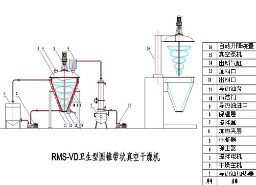 三、工作原理 加熱錐體設(shè)有加熱夾套,熱源為熱水、導(dǎo)熱油或低壓蒸汽,從而能使錐體內(nèi)壁保持一定的加熱溫度。工作時(shí),在真空泵的作用下,機(jī)內(nèi)保持一定的真空條件。傳動(dòng)系統(tǒng)帶動(dòng)螺旋帶狀攪拌裝置旋轉(zhuǎn),物料在攪拌的作用下在設(shè)備內(nèi)部不斷地翻動(dòng),并與錐體內(nèi)壁充分接觸,實(shí)現(xiàn)熱量傳遞,從而使物料內(nèi)部水分不斷蒸發(fā),水蒸汽由真空泵引出,經(jīng)冷凝器收集。干燥完成后,打開下部的出料閥出料。